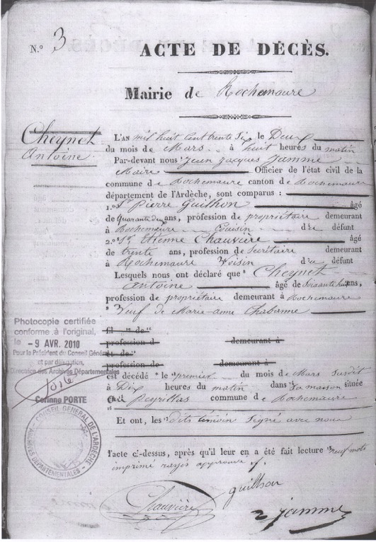 Le vrai aussi à la Mairie Très surprenant : l'acte de décès de Jean Cheynet ainsi que ceux de ses deux frères Antoine et Joseph sont intactes à la Maîrie de Rochemaure. C'est une preuve supplémentaire que les actes de naissance et de mariage présents actuellement à la mairie sont des faux. |