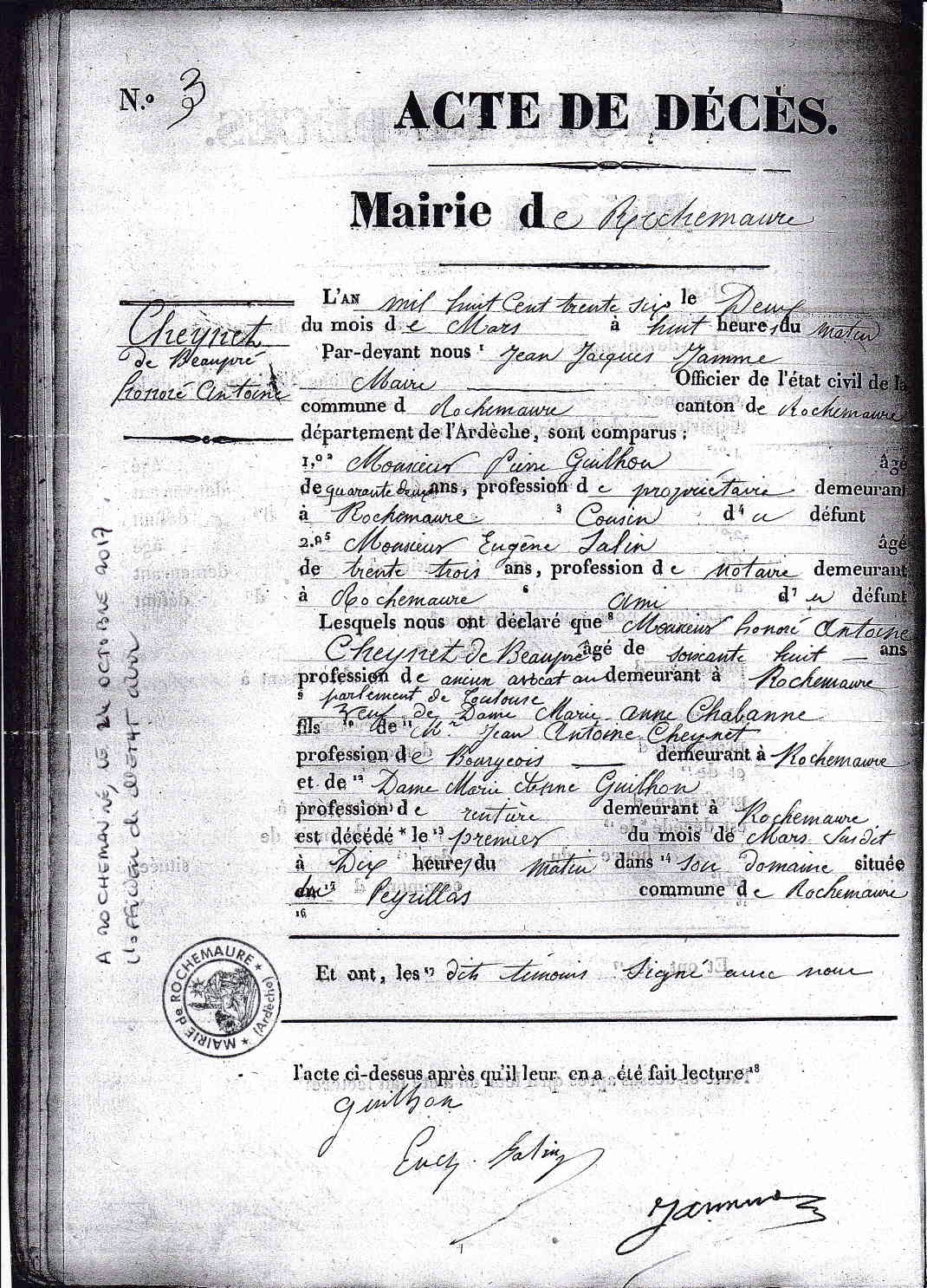 Mairie de Rochemaure Cheynet de Beaupré Honoré Antoine L'an mil huit cent trente six le deux du mois de Mars à huit heures du matin par-devant nous Jean Jacques Jamme, Maire______ Officier de l'état civil de la commune de Rochemaure canton de Rochemaure département de l'Ardèche, sont comparus : 1° Monsieur Pierre Guilhon________ âgé de quarante deux ans, profession de propriétaire demeurant à Rochemaure ____Cousin____du défunt 2° Monsieur Eugène Salin________ âgé de trente trois ans, profession de Notaire demeurant à Rochemaure ____ami____du défunt Lesquels nous ont déclaré que Monsieur Honoré Antoine Cheynet de Beaupré________ âgé de soixante huit ans profession de ancien avocat au parlement de Toulouse demeurant à Rochemaure Veuf de Dame Marie-Anne Chabanne________ Fils de Mr Jean Antoine Cheynet Profession de Bourgeois demeurant à Rochemaure Et de Dame Marie Anne Guilhon Profession de rentière demeurant à Rochemaure Est décédé * le premier du mois de mars susdit à Dix heures du matin dans son domaine située au Peyrillas commune de Rochemaure Et ont les dits témoins signé avec nous l'acte ci-dessus après qu'il leur en a été fait lecture. |
