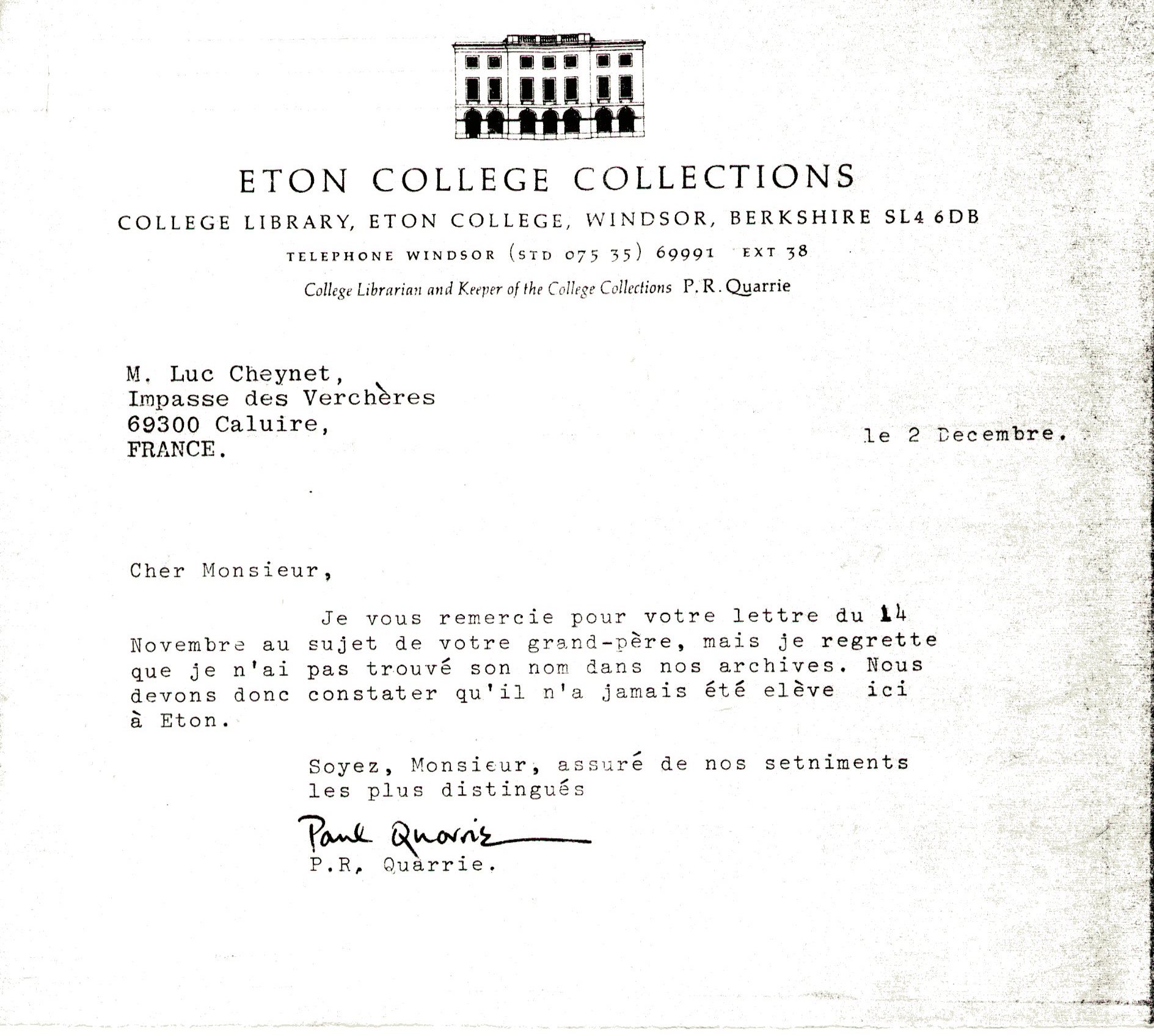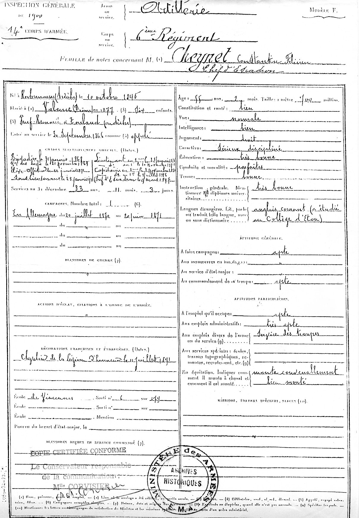 Le vrai Comme on peut le constater sur les archives départementales de l'Ardèche, Constantin s'appelle bien Cheynet sur son acte de naissance. On y voit par ailleurs que son père se nommait bien Jean Cheynet et qu'il était cultivateur. Cet acte d'état-civil est d'ailleurs disponible en ligne à cet endroit[2]. Constantin ne savait nullement parler anglais et n'a jamais mis les pieds à Eton[3], ce que cette préstigieuse école anglaise nous a confirmé. Eton n'est d'ailleurs pas un collège au sens où on l'entend en France, mais une pension pour jeunes garçons de 13 à 18 ans.[4] Il n'existe d'ailleurs aucune trace indiquant qu'il n'ait fait ne serait-ce qu'un court voyage au Royaume-Uni. Sur son acte de décès disponible ici, il est écrit : "Chef d’Escadron en Retraite ; Chevalier de la Légion d’Honneur ; fils de Jean Cheynet et de Madeleine Barral, époux décédé ; veuf de Marie Henriette Louise Vinson."[5][6] Constantin Cheynet a été nommé Chevalier de la Légion d'Honneur le 11 juillet 1891 comme on peut le voir sur sa fiche militaire disponible ici.[7] Sur cette fiche, on peut voir qu'il ne se nommait absolument pas Cheynet de Beaupré, mais bien Cheynet.