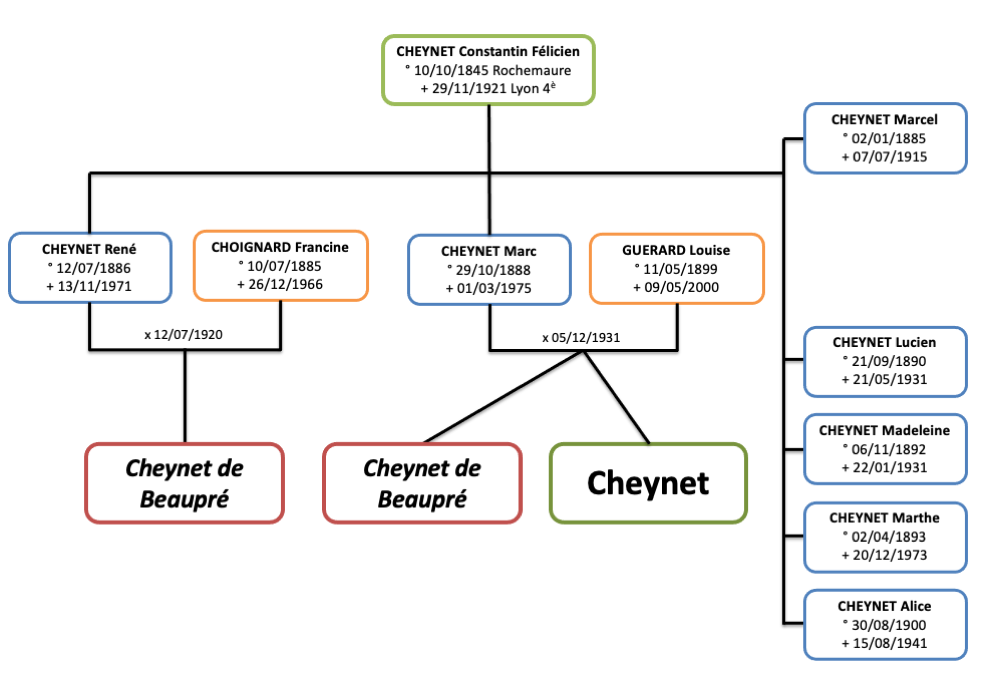 Le nom Cheynet de Beaupré n’a été officialisé que très recemment, c'est-à-dire en 1987. Certains membres de la famille ont accepté la proposition faite par par l'un des membres de la famille de modifier leur patronyme en s'appuyant sur des documents – comme nous allons le voir plus que douteux –, tandis que d'autres l'ont refusé et ont préféré consever le vrai nom de leurs ancètres Cheynet.