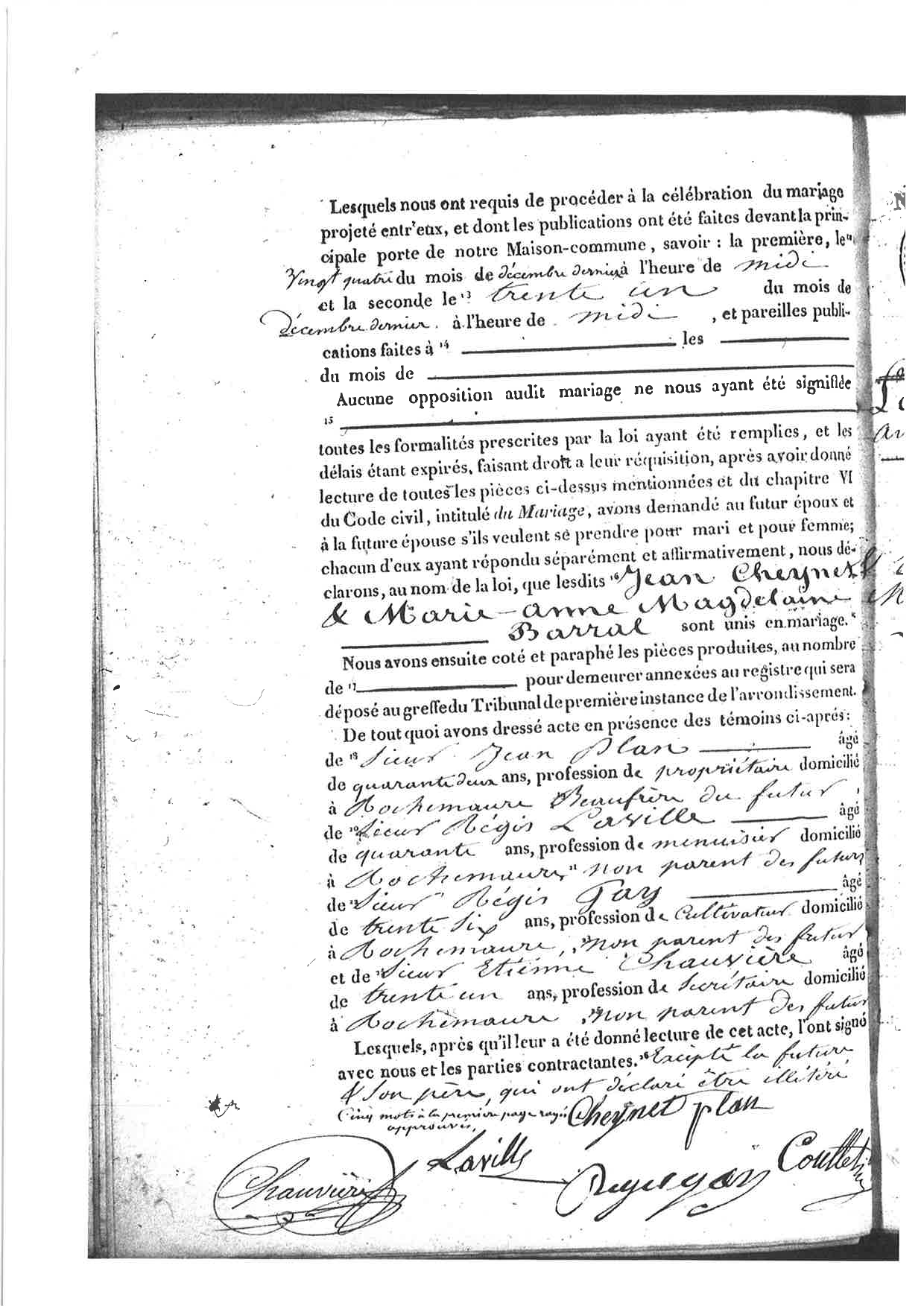 "ACTE DE MARIAGE Mairie de Rochemaure L'an mil huit cent trente huit le neuvième jour du mois de Janvier à huit heures du matin par-devant nous Henry Gratien Coullet, adjoint faisant fonction D'officier de l'état civil de la commune de Rochemaure canton de Rochemaure département de l'Ardèche, sont comparus : 1° Sieur Jean Cheynet âgé de Vingt-trois ans, profession de Cultivateur natif de Rochemaure domicilié à Rochemaure fils majeur de feux Antoine Cheynet profession d________ domicilié à ________ et de feue Marie Chabanne profession d________ domiciliée à ________ 2° Marie Magdelaine Barral âgée de Vingt-sept ans, profession de ménagère native de Rochemaure domiciliée à Rochemaure fille majeure de Jean Martin Barral profession de cultivateur domicilié à Rochemaure et de Marie-Anne Datui profession de ménagère domiciliée à Rochemaure ladite comparante ayant le consentement de ses père & mère ici présents. Lesquels nous ont requis de procéder à la célébration du mariage projeté entre'eux, et donc les publications ont été faites devant la principale porte de notre Maison-commune, savoir : la première le vingt-quatre du mois de Décembre dernier à l'heure de midi et la seconde le trente un du mois de Décembre dernier à l'heure de midi, et pareilles publications faites à ________ les ________ du mois de ________ Aucune opposition audit mariage ne nous ayant été signifiée ________ toutes les formalités prescrites par la loi ayant été remplies, et les délais étant expirés, faisant droit à leur réquisition, après avoir donné lecture de toutes les pièces ci-dessus mentionées et du chapitre VI du Code civil, intitulé du Mariage, nous avons demandé au futur époux et à la future épouse s'ils veulent se prendre pour mari et pour femme ; chacun d'eux ayant répondu séparément et affirmativement, nous déclarons, au nom de la loi, que lesdits Jean Cheynet & Marie-Anne Magdelaine ________ Barral sont unis en mariage. Nous avons ensuite coté et paraphé les pièces produites, au nombre de ________ pour demeurer annexées au registre qui sera déposé au greffe du Tribunal de première instance de l'arrondissement. De tout quoi avons dressé acte en présence des témoins ci-après : de Sieur Jean Plan âgé de quarante deux ans, profession de propriétaire domicilié à Rochemaure Beaufrère du futur, de Sieur Régis Laville âgé de quarante ans, profession de menuisier domicilié à Rochemaure non parent des futurs, de Sieur Régis Gay âgé de trente six ans, profession de cultivateur domiciié à Rochemaure, non parent des futurs et de Sieur Etienne Chauvière âgé de trente un an, profession de secrétaire domicilié à Rochemaure, non parent des futurs. Lesquels, après qu'il leur a été donné lecture de cet acte, l'ont signé avec nous et les parties contractantes. Excepté la future & son père, qui ont déclaré être illetré. Cinq mots à la première page rayés, approuvé" |