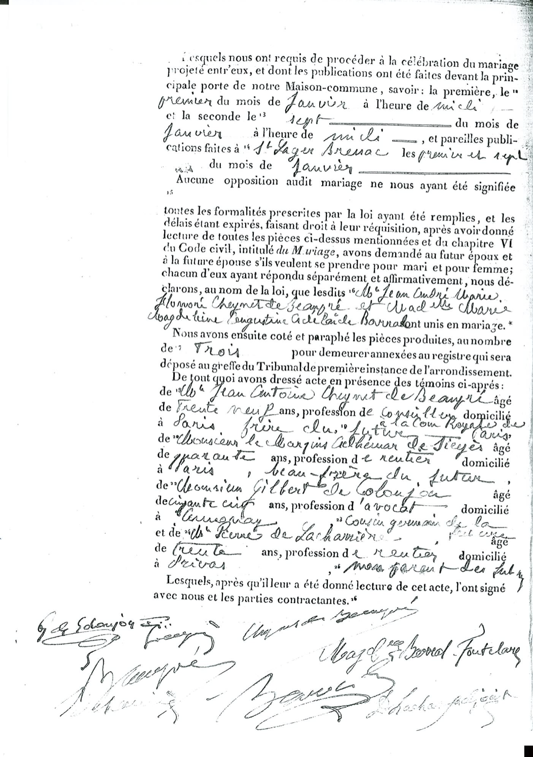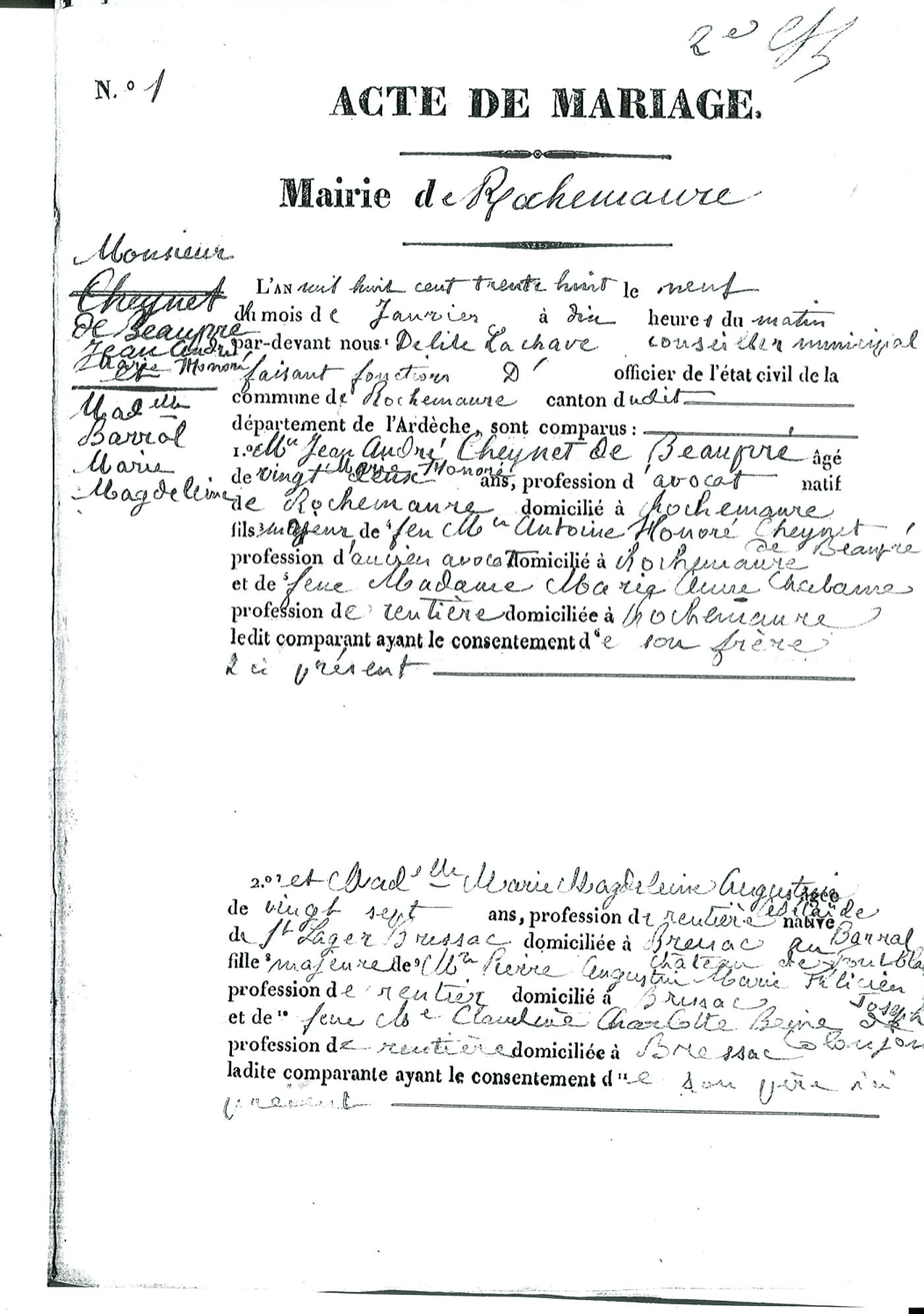 "ACTE DE MARIAGE Mairie de Rochemaure L'an mil huit cent trente huit le neuf du mois de Janvier à dix heures du matin par-devant nous Delite Lachave conseiller municipal faisant fonction D'officier de l'état civili de la commune de Rochemaure canton dudit ________ département de l'Ardèche, sont comparus : 1° Mr Jean André Marie Honoré Cheynet de Beaupré âgé de Vingt-deux ans, profession d'avocat natif de Rochemaure domicilié à Rochemaure fils majeur de feux Mr Antoine Honoré Cheynet de Beaupré profession d'ancien avocat domicilié à Rochemaure et de feux Madame Marie Anne Chabanne profession de rentière domiciliée à Rochemaure le dit comparant ayant le consentement de son frère ici présent. 2° Mademoiselle Marie Magdelaine Augustine Adélaïde Barral âgée de Vingt-sept ans, profession de rentière native de St Lager Bressac domiciliée à Bressac au château de Fontblachère fille majeure de Monsieur Pierre Augustin Marie Félicien Joseph Barral profession de rentier domicilié à Bressac et de feux Madame Claudine Charlotte Rein Coloujon profession de rentière domiciliée à Bressac ladite comparante ayant le consentement de son père ici présent. Lesquels nous ont requis de procéder à la célébration du mariage projeté entre'eux, et donc les publications ont été faites devant la principale porte de notre Maison-commune, savoir : la première le premier du mois de Janvier à l'heure de midi et la seconde le sept du mois de Janvier à l'heure de midi, et pareilles publications faites à St Lager Bressac les premier et sept du mois de Janvier. Aucune opposition audit mariage ne nous ayant été signifiée ________ toutes les formalités prescrites par la loi ayant été remplies, et les délais étant expirés, faisant droit à leur réquisition, après avoir donné lecture de toutes les pièces ci-dessus mentionées et du chapitre VI du Code civil, intitulé du Mariage, nous avons demandé au futur époux et à la future épouse s'ils veulent se prendre pour mari et pour femme ; chacun d'eux ayant répondu séparément et affirmativement, nous déclarons, au nom de la loi, que lesdits Mr Jean André Marie Honoré Cheynet de Beaupré & Mademoiselle Marie Magdelaine Augustine Adélaïde Barral sont unis en mariage. Nous avons ensuite coté et paraphé les pièces produites, au nombre de trois pour demeurer annexées au registre qui sera déposé au greffe du Tribunal de première instance de l'arrondissement. De tout quoi avons dressé acte en présence des témoins ci-après : de Mr Jean Antoine Cheynet de Beaupré âgé de trente neuf ans, profession de conseiller à la cour Royale de Paris domicilié à Paris frère du futur, de Monsieur le Marquis Adhémar de Sieyes âgé de quarante ans, profession de rentier domicilié à Paris, beau-frère du futur, de Monsieur Gilbert de Coloujon âgé de cinquante cinq ans, profession d'avocat domicilié à Annonay, cousin germain de la future et de Mr Pierre de Lacharrière âgé de trente, profession de rentier domiclié à Privas, non parent des futurs. Lesquels, après qu'il leur a été donné lecture de cet acte, l'ont signé avec nous et les parties contractantes." |