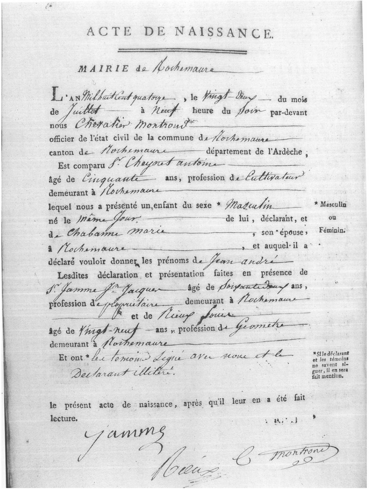 "L'an Mil huit Cent quatorze, le Vingt-Deux du mois de Juillet à Neuf heure du Soir par-devant nous Chevalier Montrond officier de l'état civil de la commune de Rochemaure canton de Rochemaure département de l'Ardèche, Est comparu Sr Cheynet antoine âgé de Cinquante ans, profession de Cultivateur demeurant à Rochemaure lequel nous a présenté un enfant de sexe Masculin né le Même Jour de lui, déclarant, et de Chabanne Marie, son épouse, à Rochemaure, et auquel il a déclaré vouloir donner les prénoms de Jean andré. Lesdites déclaration et présentation faites en présence de Sr Jamme Jn Jacques âgé de Soixante Deux ans, profession de propriétaire demeurant à Rochemaure et de Mieux Louis âgé de Ving-neuf ans, profession de Geomètre demeurant à Rochemaure. Et on le témoin signé avec nous et le déclarant illétré. Le présent acte de naissance, après qu'il leur a été fait lecture." |