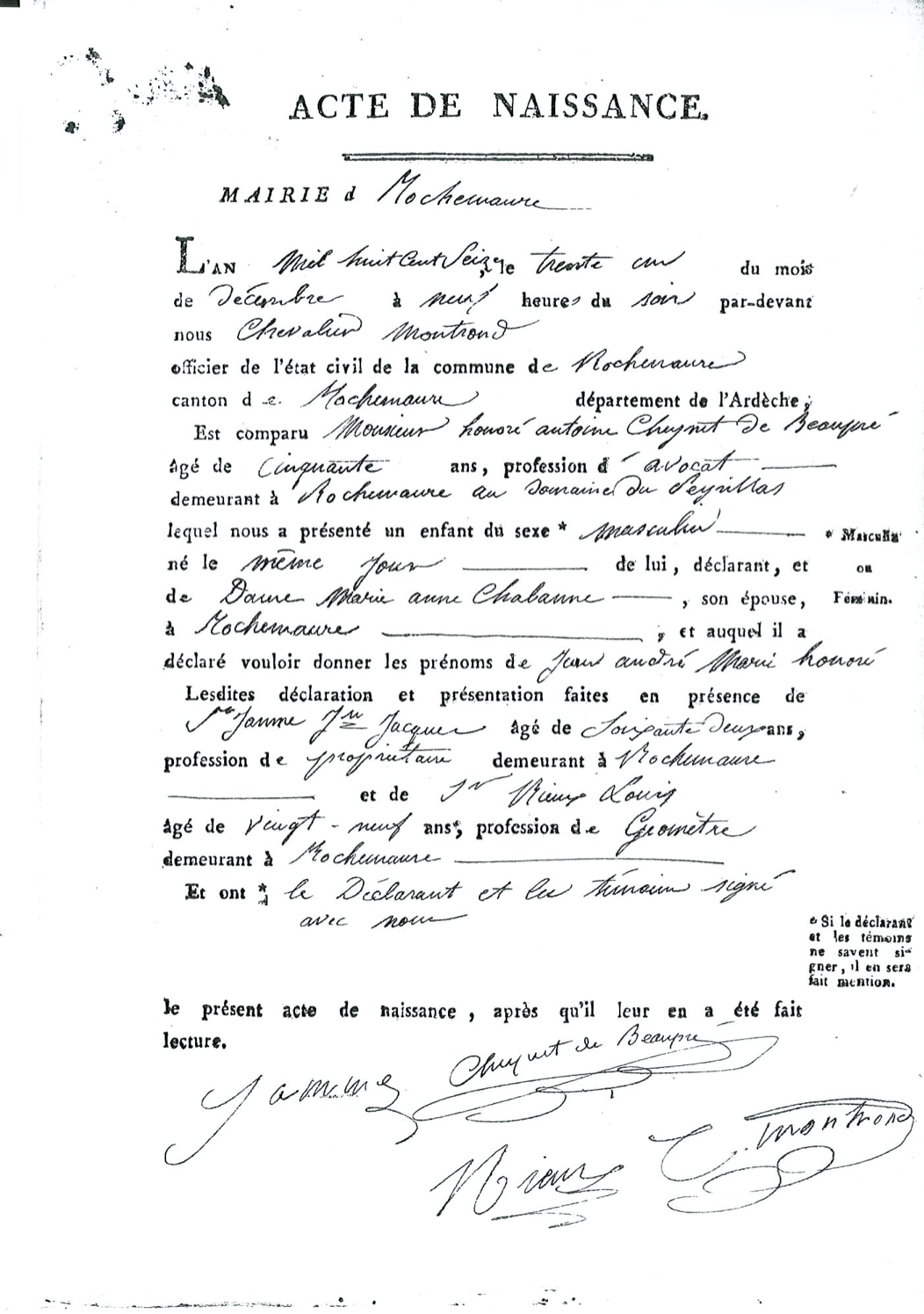 "L'an Mil huit Cent seize, le trente un du mois de Décembre à Neuf heure du Soir par-devant nous Chevalier Montrond officier de l'état civil de la commune de Rochemaure canton de Rochemaure département de l'Ardèche, Est comparu Monsieur honoré antoine Cheynet de Beaupré âgé de Cinquante ans, profession d'avocat, demeurant à Rochemaure au domaine du Perillas lequel nous a présenté un enfant de sexe Masculin né le Même Jour de lui, déclarant, et de Dame Marie anne Chabanne , son épouse, à Rochemaure, et auquel il a déclaré vouloir donenr les prénoms de Jean andré Marie honoré. Lesdites déclaration et présentation faites en présence de Sr Jamme Jn Jacques âgé de Soixante Deux ans, profession de propriétaire demeurant à Rochemaure et de Mieux Louis âgé de Ving-neuf ans, profession de Geomètre demeurant à Rochemaure. Et on le Déclarant et le témoin signé avec nous. Le présent acte de naissance, après qu'il leur a été fait lecture." |