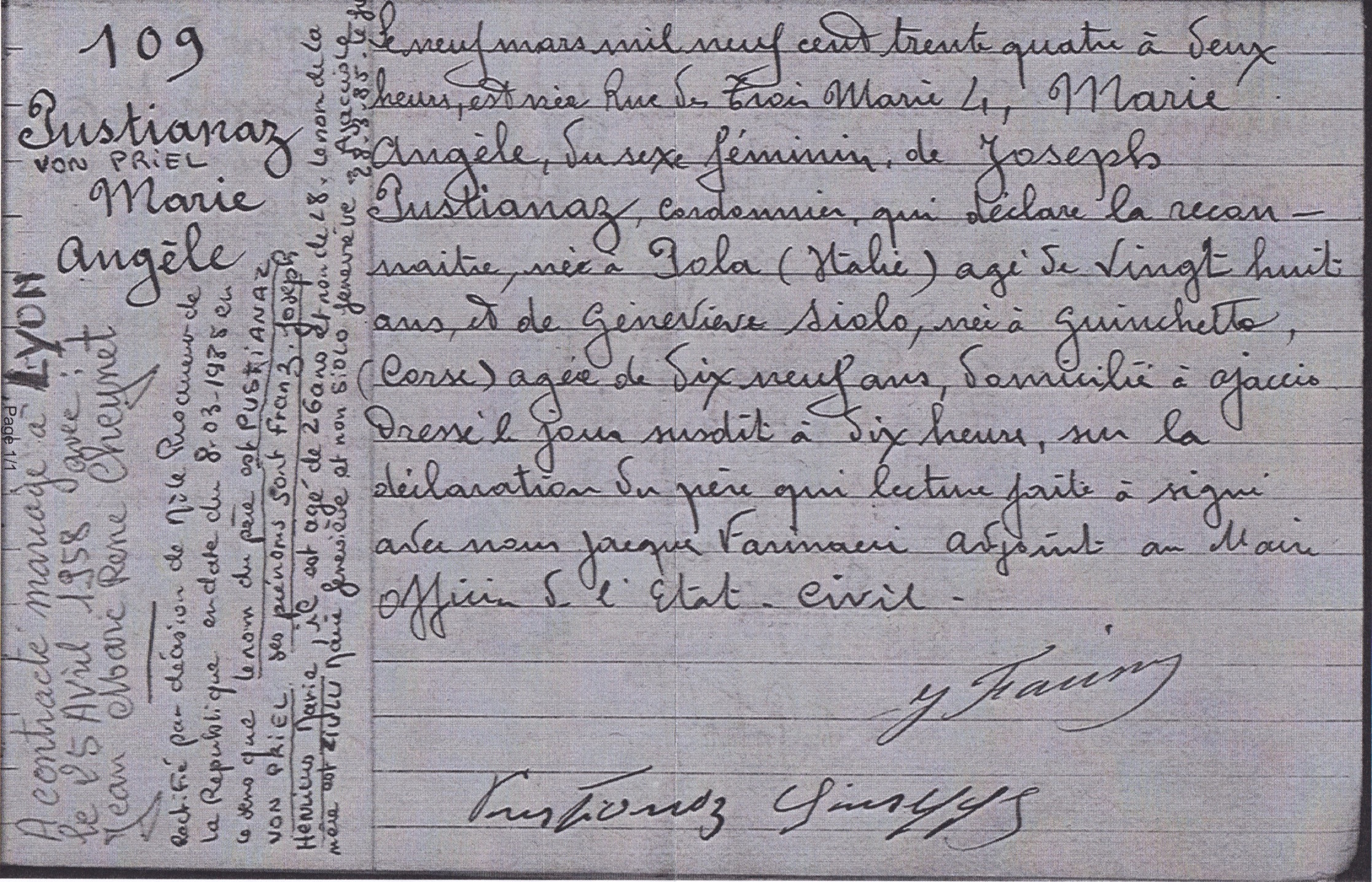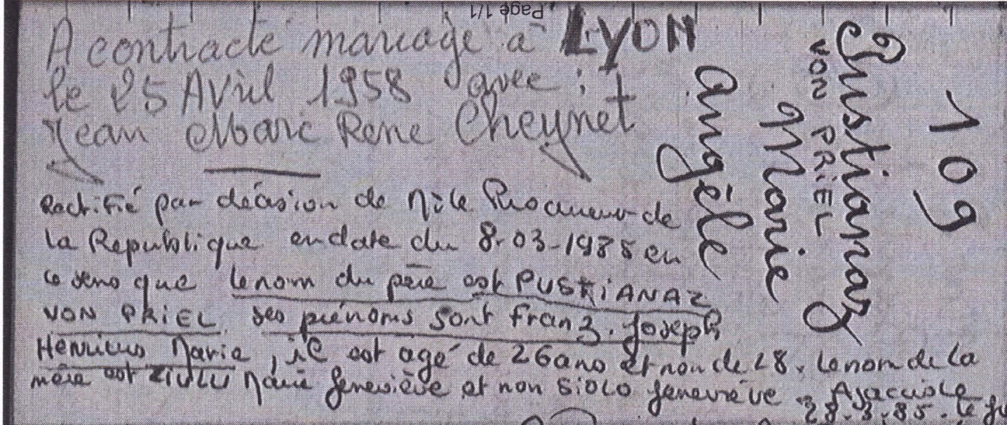 A contracté mariage à LYON le 25 Avril 1958 avec : Jean Marc René Cheynet Rectifié par décision de Mr le Procureur de la République en date du 8-03-1985 en ce sens que le nom du père est PUSTIANAZ VON PRIEL. Ses prénoms sont Franz Joseph Henricus Marie, il est âgé de 26 ans et non de 28. Le nom de la mère est ZIULU Marie Geneviève et non SIOLO Geneviève. Ajaccio le 28-3-85 Le greffier |