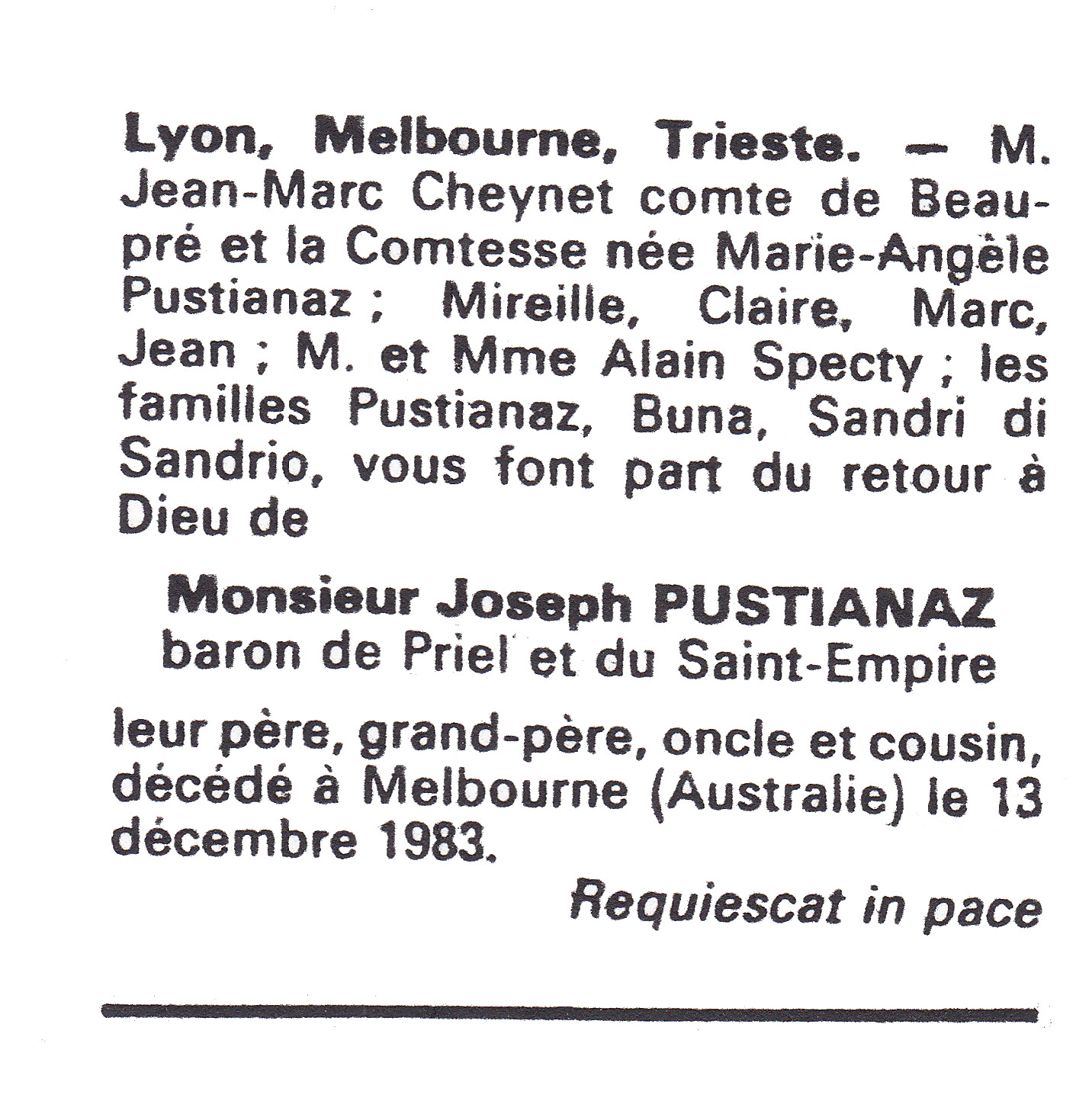 Sur l'acte de decès de 1983[2], Guiseppe s'appelle toujours Pustianaz et non Pustianaz von Priel. Il est de profession "cleaner" et son père était "farmer".